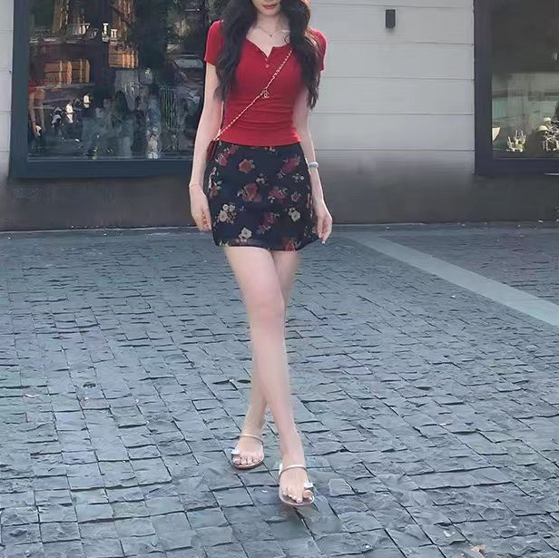 Yiyao Korean pure temperament knitted sweater for women in summer slim short-sleeved top + floral skirt suit