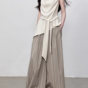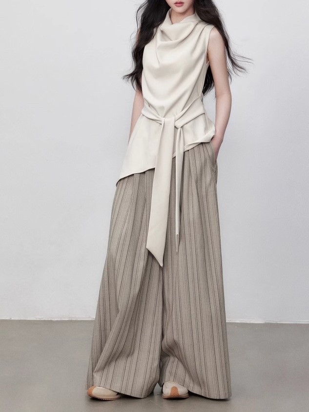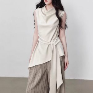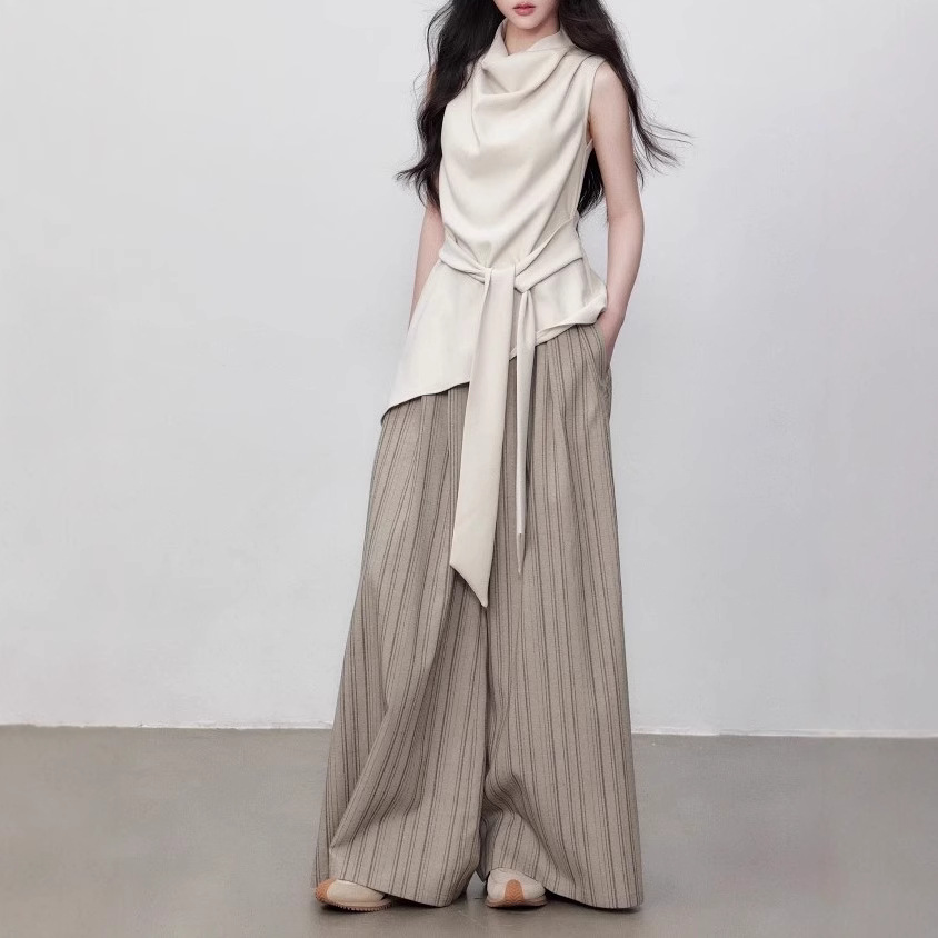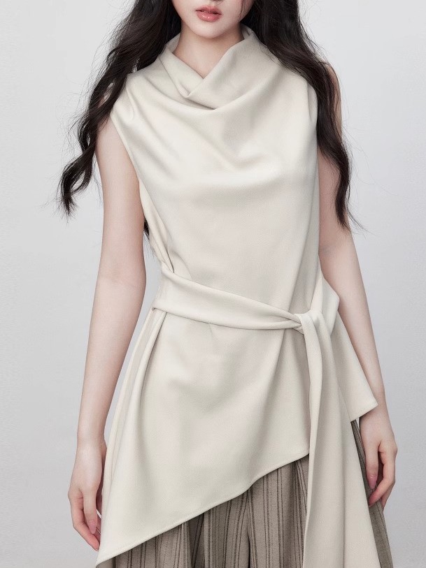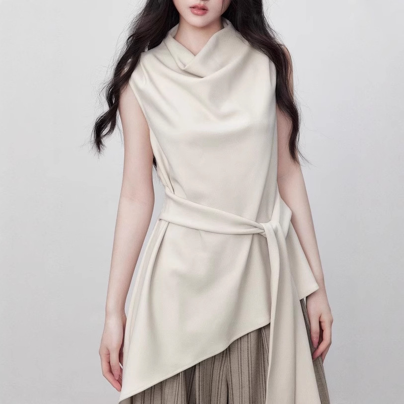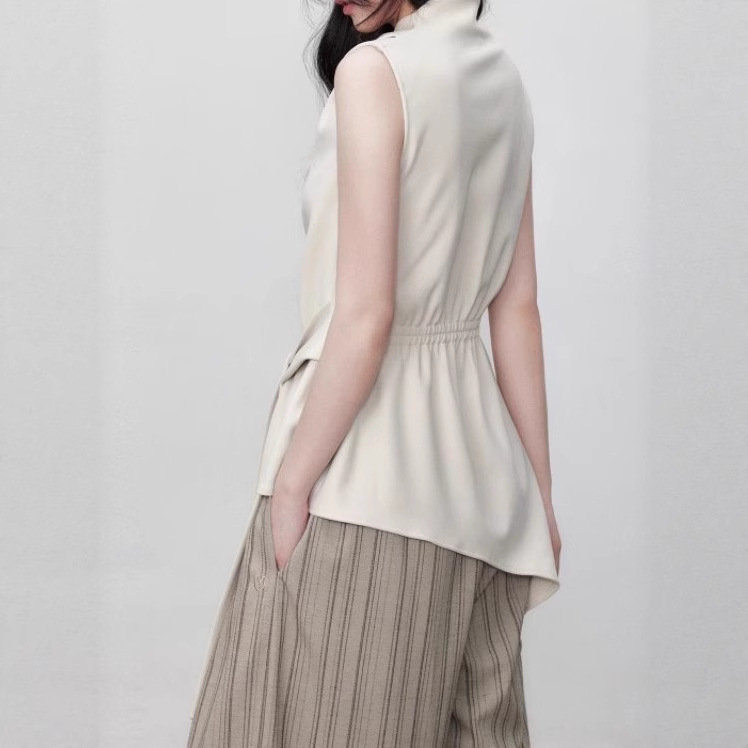 Yuzhi high-quality sleeveless top summer lace-up waist-hugging design temperament beige-white shirt for women