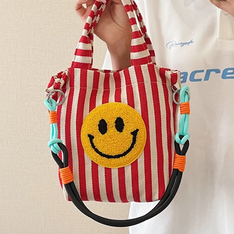 Cute smiling hand-held canvas bag large capacity simple commuting bucket bag fashionable striped design shoulder bag