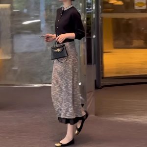 Early autumn outfits a complete set of women’s salt-style light-mature black knitted tops spliced skirts and temperament two-piece suit