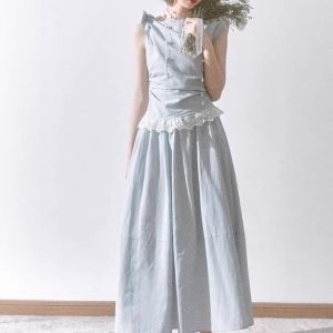 Feney Blue Breakfast Sleeveless Asymmetrical Lace Top + Long Skirt Set