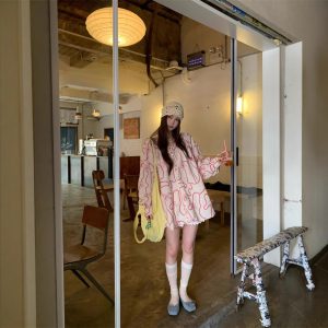 Real photo of casual and versatile striped pocket shirt for women in autumn silhouette splicing contrast color long-sleeved cardigan top
