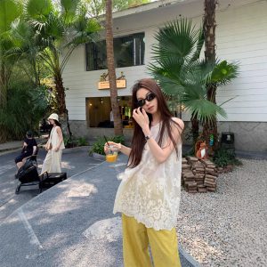 Real photo of Korean gentle style collar yellow hollow embroidered shirt mid-length waist sleeveless lace top