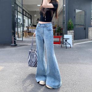 Real-life photo of spring and summer loose and slightly flared elastic jeans for women with high waist wide-leg pants