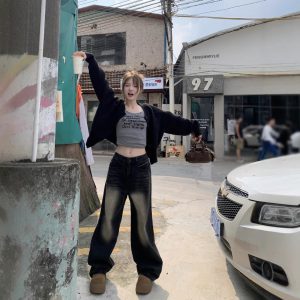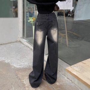 Real-life spring embroidery washing charcoal black jeans high waist slimming wide-leg pants for women
