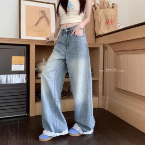 Real photo American retro lace splicing design wide-leg jeans women’s high waist slim floor trousers spring
