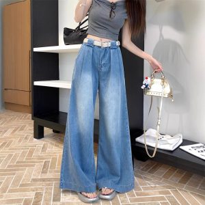 Real photo~ American retro wide-leg jeans for women with high waist loose design floor trousers