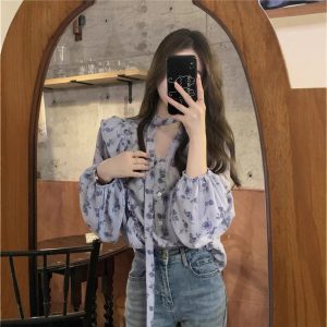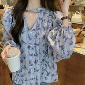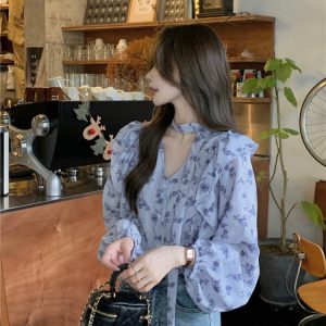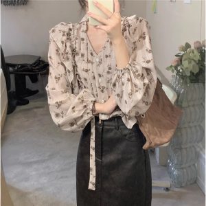 Real photo of early spring French mature style versatile collar shirt single-breasted ruffled lace-up printed top for women