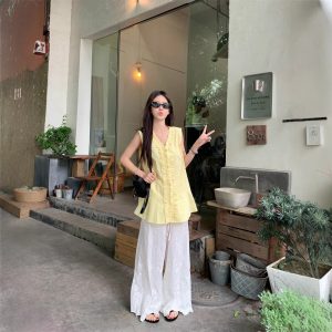 Real photos of Korean style, loose slim collar shirt, casual and versatile lace wide-leg pants suit for women