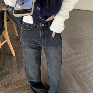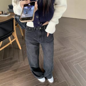 Real shot, design-cut slim jeans for women, early spring high waist loose wide-leg pants, trousers trendy