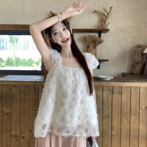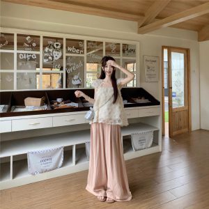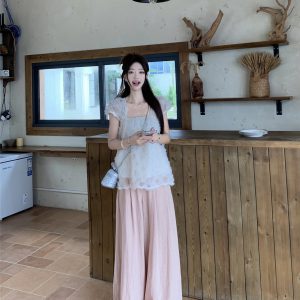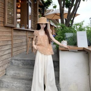 Real shot of sweet heavy industry three-dimensional mesh fluffy hem small flying sleeve top high waist versatile wide-leg pants suit