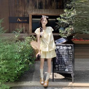 Real shot~ Sweet Korean style loose lace-up short sleeve shirt wide-leg shorts small fashion suit